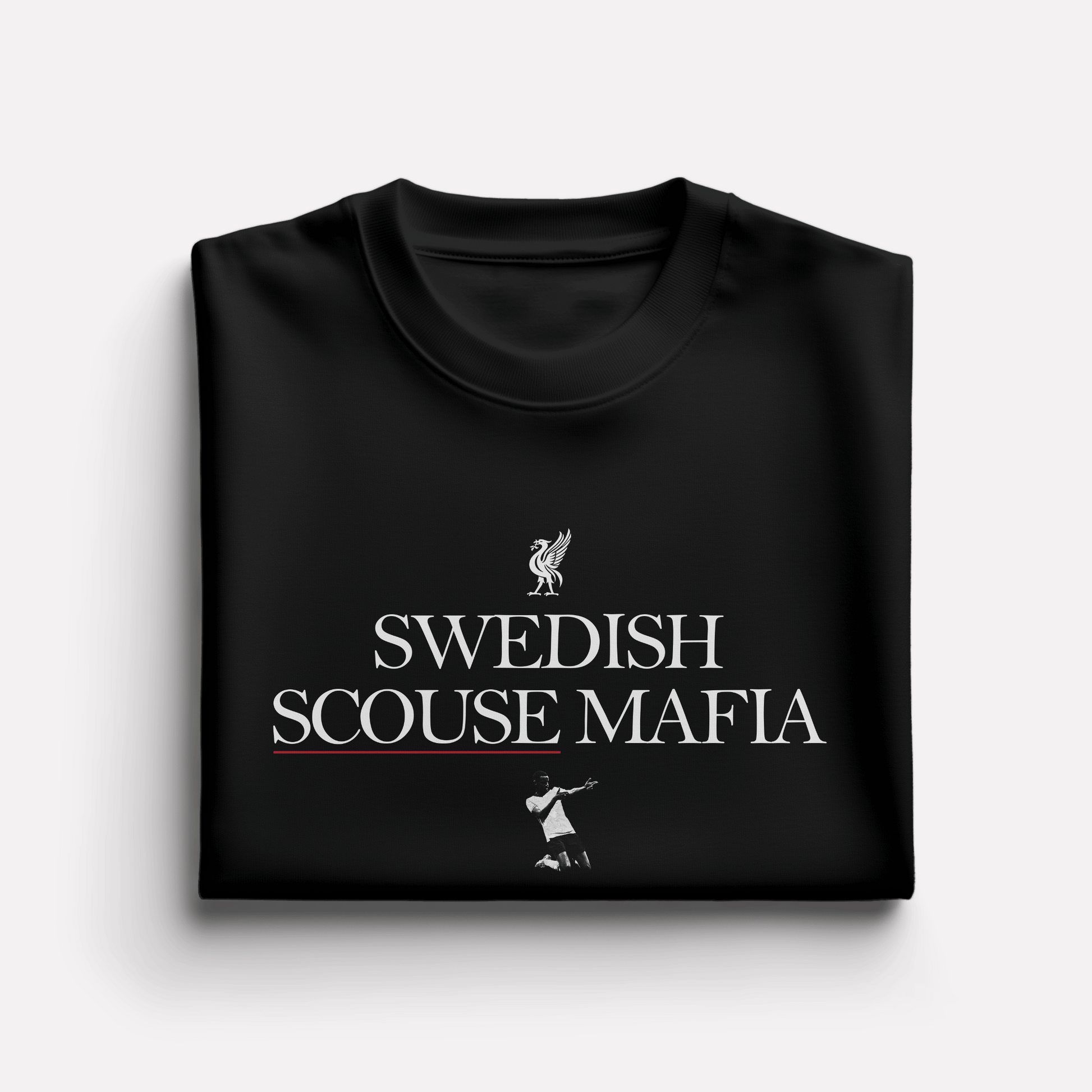 The 'Swedish Scouse Mafia' Isak T-Shirt celebrates LFC's new signing, Alexander Isak, with a unique edit of the Swedish House Mafia logo. The shirt also features the iconic Liverbird and a photo of Isak doing his signature celebration.